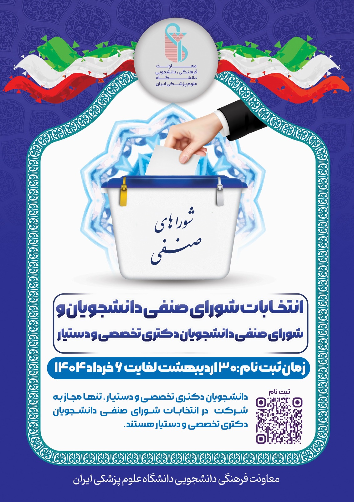 * مرحله ثبت نام اولیه داوطلبان عضویت در شوراهای صنفی از طریق لینک https://survey.porsline.ir/s/PEXUIwA7 انجام می گیرد و انتخابات از طریق سامانه انتخابات برگزار خواهد شد.