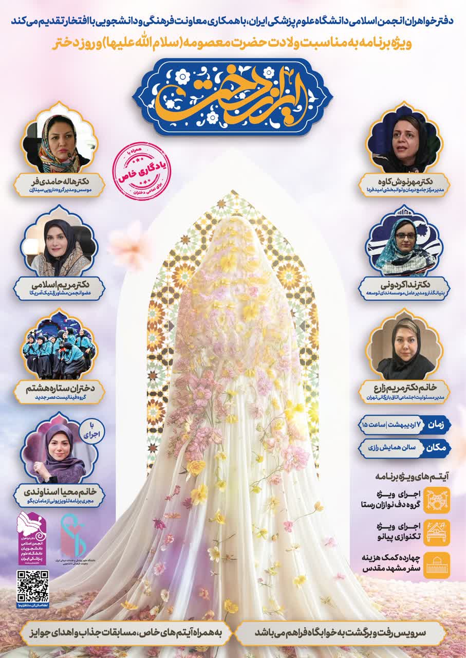 برگزاری مراسم جشن روز دختر به مناسبت ولادت با سعادت حضرت معصومه(س) . تاریخ برگزاری:روز یکشنبه مورخ ۱۴۰۴/۲/۷ مکان : سالن ۱۰۰۰ نفره مرکز همایشهای رازی از ساعت ۱۵:۳۰لغایت ۱۹:۰۰ حضور بانوان شاغل به همراه فرزندان نوجوان دختر ۱۶ سال به بالا بلامانع می باشد.